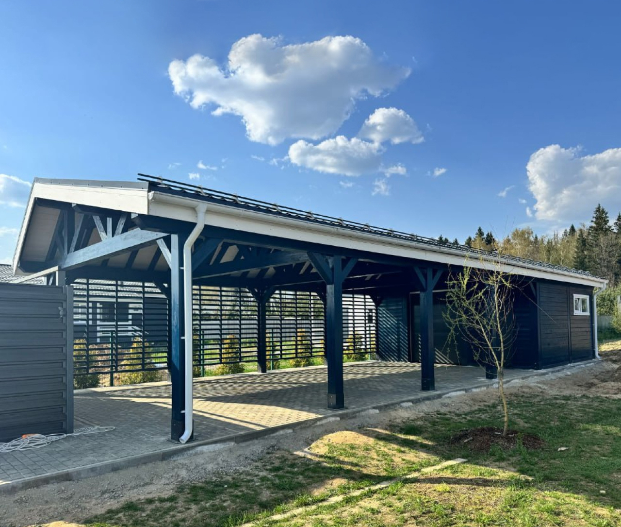 Навес для автомобилей с хозблоком СКАГЕН — компактное решение «два в одном», объединяющее парковочное место для одного автомобиля и полноценное подсобное помещение на ограниченной территории участка. Продольная компоновка 8,4×4,2 м максимально эффективно использует 35 м² площади, создавая функциональный комплекс там, где каждый квадратный метр на счету. Коньковая кровля с классическими скатами надежно отводит влагу в стороны, предупреждая застои и обледенение в зимний период. Деревянный остов из качественной хвойной древесины промышленной подготовки работает стабильно при смене сезонов, а продуманная конструкция узлов исключает температурные деформации. Хозяйственное отделение оборудовано входной группой и естественным освещением, позволяя удобно размещать садовый инвентарь, автопринадлежности и сезонную технику в сухих условиях. Узкий профиль навеса идеально подходит для установки вдоль границ участка или у стены дома, не нарушая общей планировки двора. Сдержанная архитектура и натуральные материалы гармонично дополняют загородную среду, а практичность эксплуатации делает СКАГЕН оптимальным выбором для рационального хозяина.