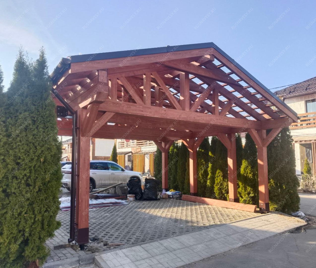 Навес для автомобилей Аларес — это функциональное и сбалансированное решение для защиты двух транспортных средств на компактной территории. Габариты 6,6×5,1 м и площадь 34 м² позволяют разместить автомобили с удобными проходами и достаточным пространством для открывания дверей, не занимая лишнюю землю на участке. Коньковая крыша с двумя скатами обеспечивает эффективный водоотвод и предотвращает скопление снега, что особенно важно в условиях частых осадков. Каркас выполнен из высококачественной хвойной древесины, прошедшей камерную сушку, что исключает деформации и гарантирует долговечность строения. Отсутствие хозблока делает всю полезную площадь доступной для парковки, а грамотная конструкция позволяет органично вписать навес в любой ландшафт. Кровельное покрытие из битумной черепицы "Shinglas" обеспечивает надежную защиту от осадков и придает навесу законченный вид.