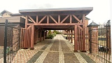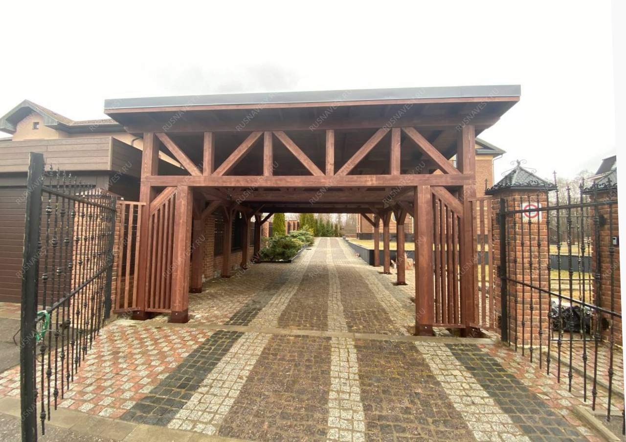 Каркас выполнен из массива хвойных пород древесины, прошедшей камерную сушку, что исключает деформации и продлевает срок службы навеса. Для опорной части используется брус сечением 190х190 или 190х240 мм, а стропильная система формируется из сухой строганой доски сечением 45х190 мм. Кровельное покрытие — гибкая черепица "Shinglas", однако по желанию заказчика возможен другой материал.