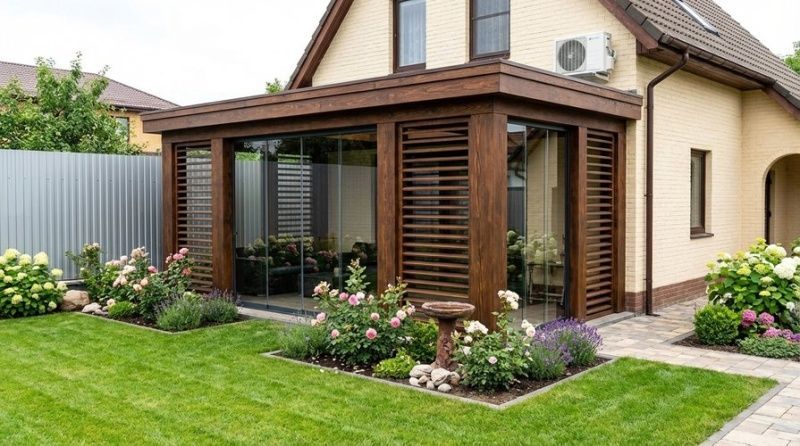 Тип конструкции. Открытая терраса дешевле застеклённой веранды. Тёплая пристройка обойдётся дороже летней. Это логично: больше материала, больше работы, сложнее узлы.