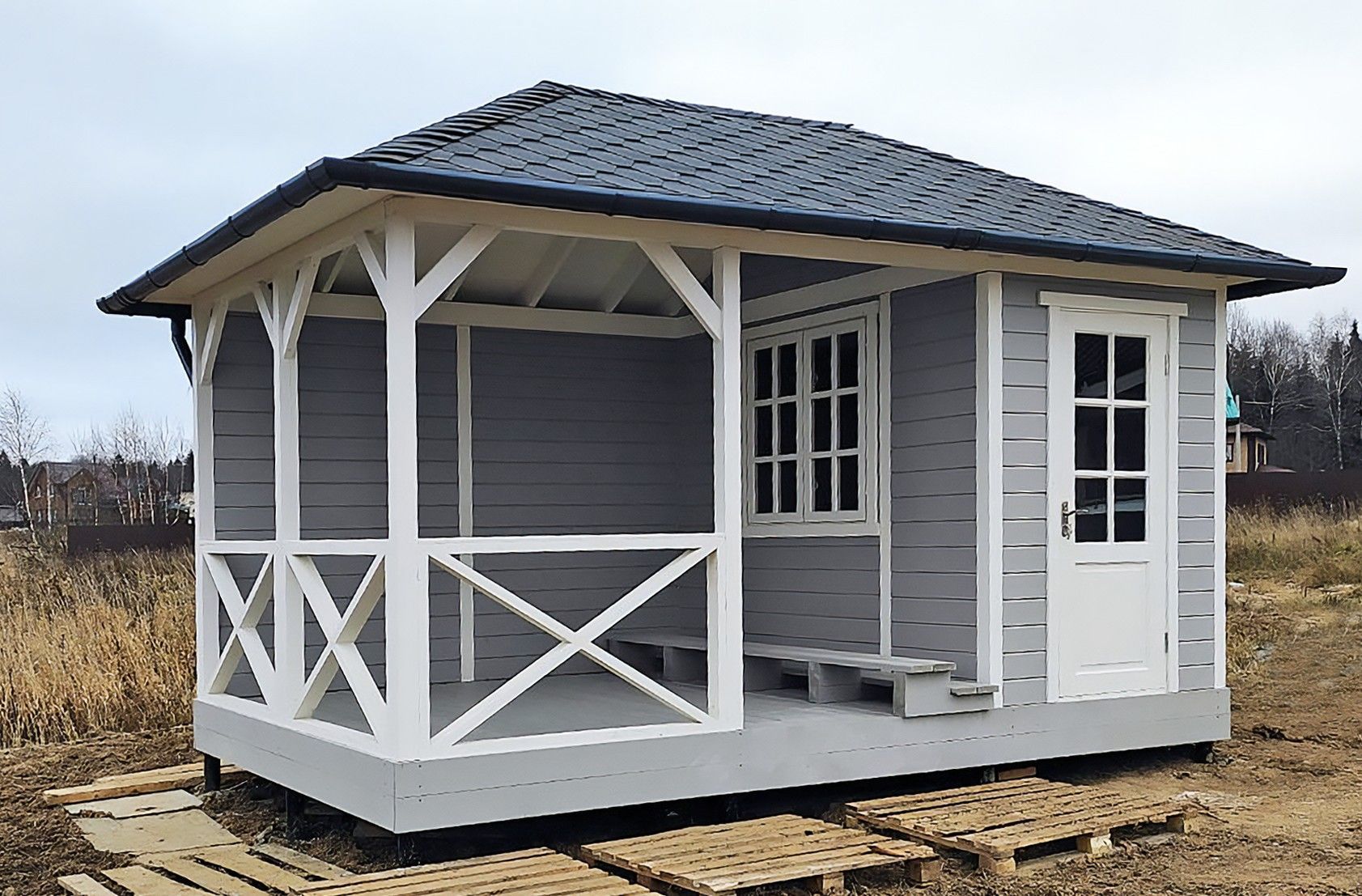 Изделия из клееного бруса предлагаются в трёх комплектациях: «несущий каркас», «базовая» и «премиум». В последнем случае стойки выполнены не из цельного массива дерева, а из клеёного бруса, а обрешётка кровли – из имитации бруса с замковым соединением.